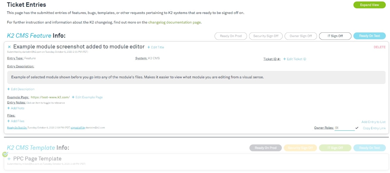 This was a project I spearheaded to originally streamline signoff processes across teams, but turned into a more widespread, generic changelog that accounted for many changes that went across the site. This tool allowed for manual entries as well as bug reports and feature requests from the admin menu. These entries allowed our development team to keep track of the progress of changes happening across the backend/frontend, new modules being created, modules requesting to be changed, change requests for our core styling/JavaScript, and anything else in between.